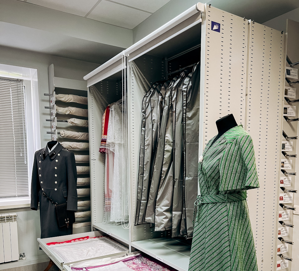Мобильные стеллажи позволяют безопасно и компактно хранить одежду, эффективно используя пространство склада или хранилища.